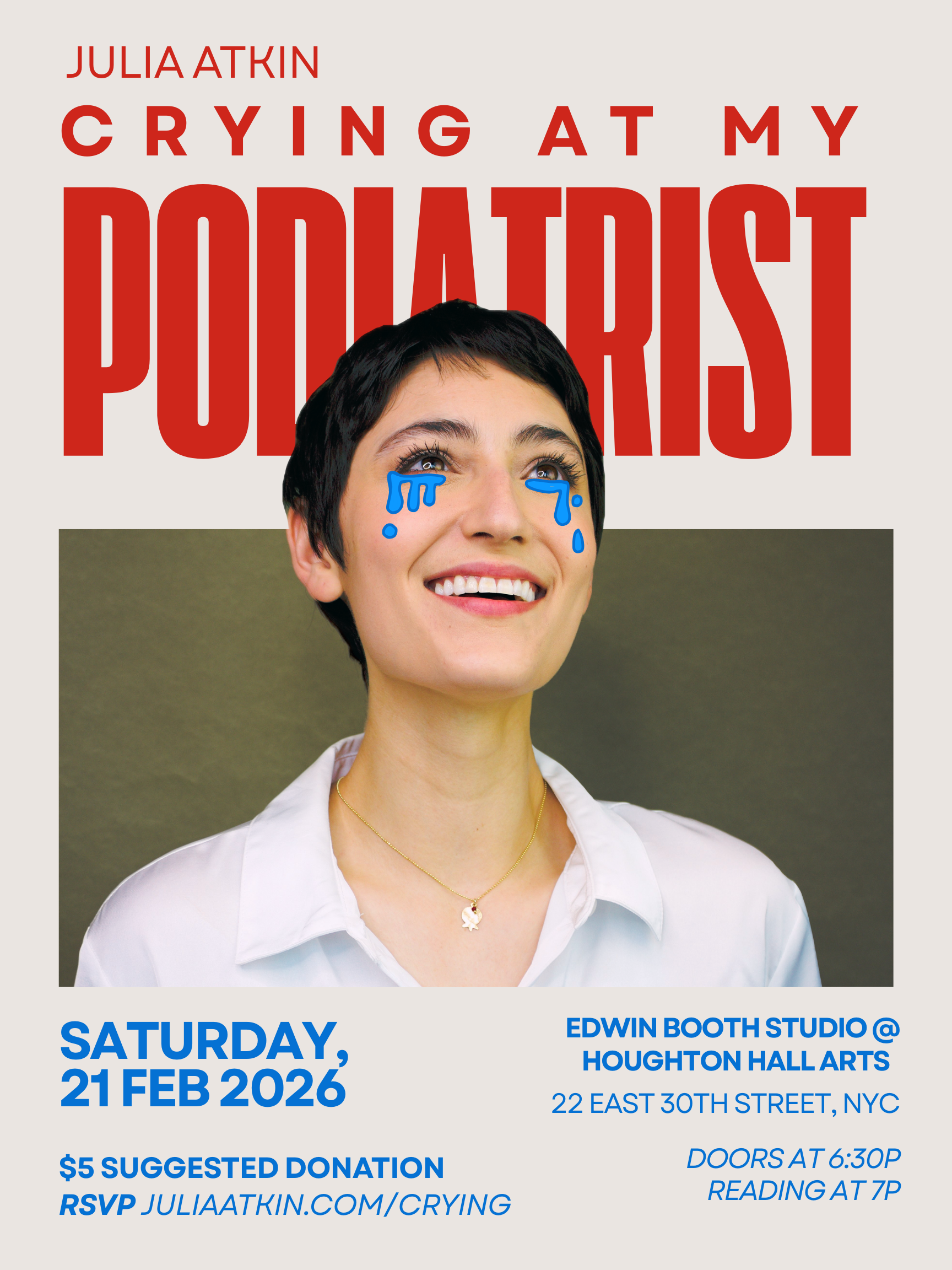 CRYING AT MY PODIATRIST is my work-in-progress solo show. It’s about how I was guided through the worst three years of my life by, I kid you not, my Ukrainian podiatrist. Think absurdist body horror meets chicken soup for the soul. Grief with giggles.